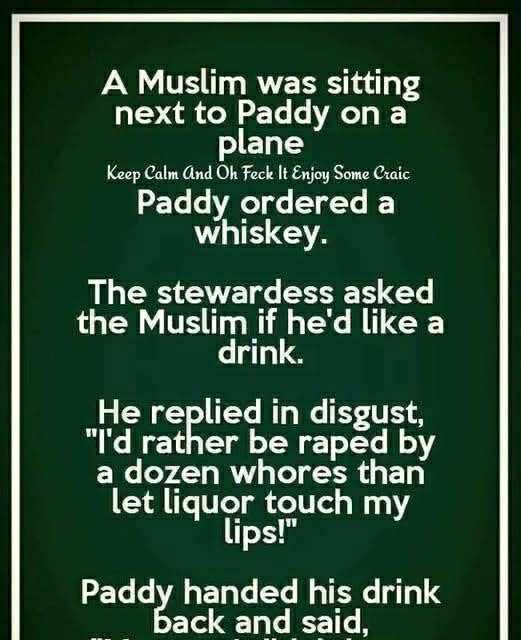 A Muslim was sitting next to Paddy on a plane. Keep Calm And Oh Feck It Enjoy Some Craic Paddy ordered a whiskey. The stewardess asked the Muslim if he’d like a drink.He replied in disgust,