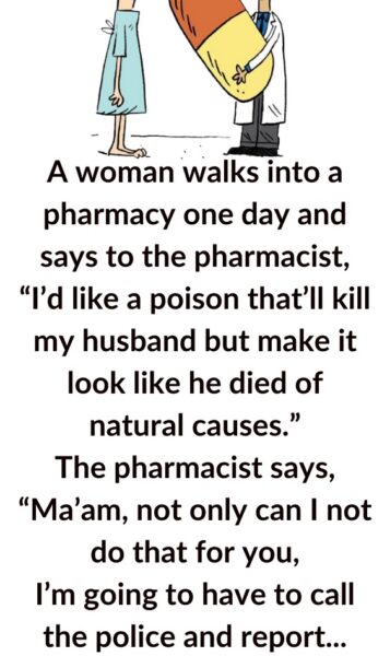 A woman walks into a pharmacy one afternoon, looking calm but determined. She approaches the counter and says to the pharmacist in a low, serious voice, “I need a poison. Something strong, fast-acting… and untraceable. It has to look like my husband died of natural causes.” The pharmacist blinks in shock, then quickly leans forward, whispering back,