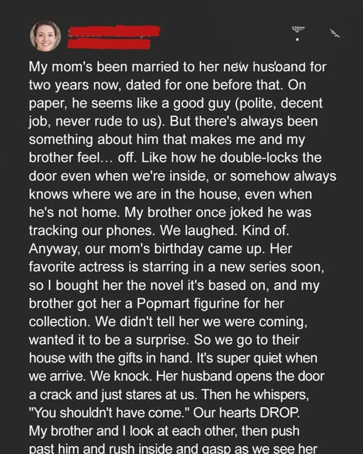 My brother Noah and I showed up at Mom’s house unannounced, birthday gifts in hand, expecting joy. Instead, her husband Rick cracked open the door and whispered, “You shouldn’t have come.” His constant watchfulness had always made us uneasy, but today felt especially off. We pushed past him to find Mom.